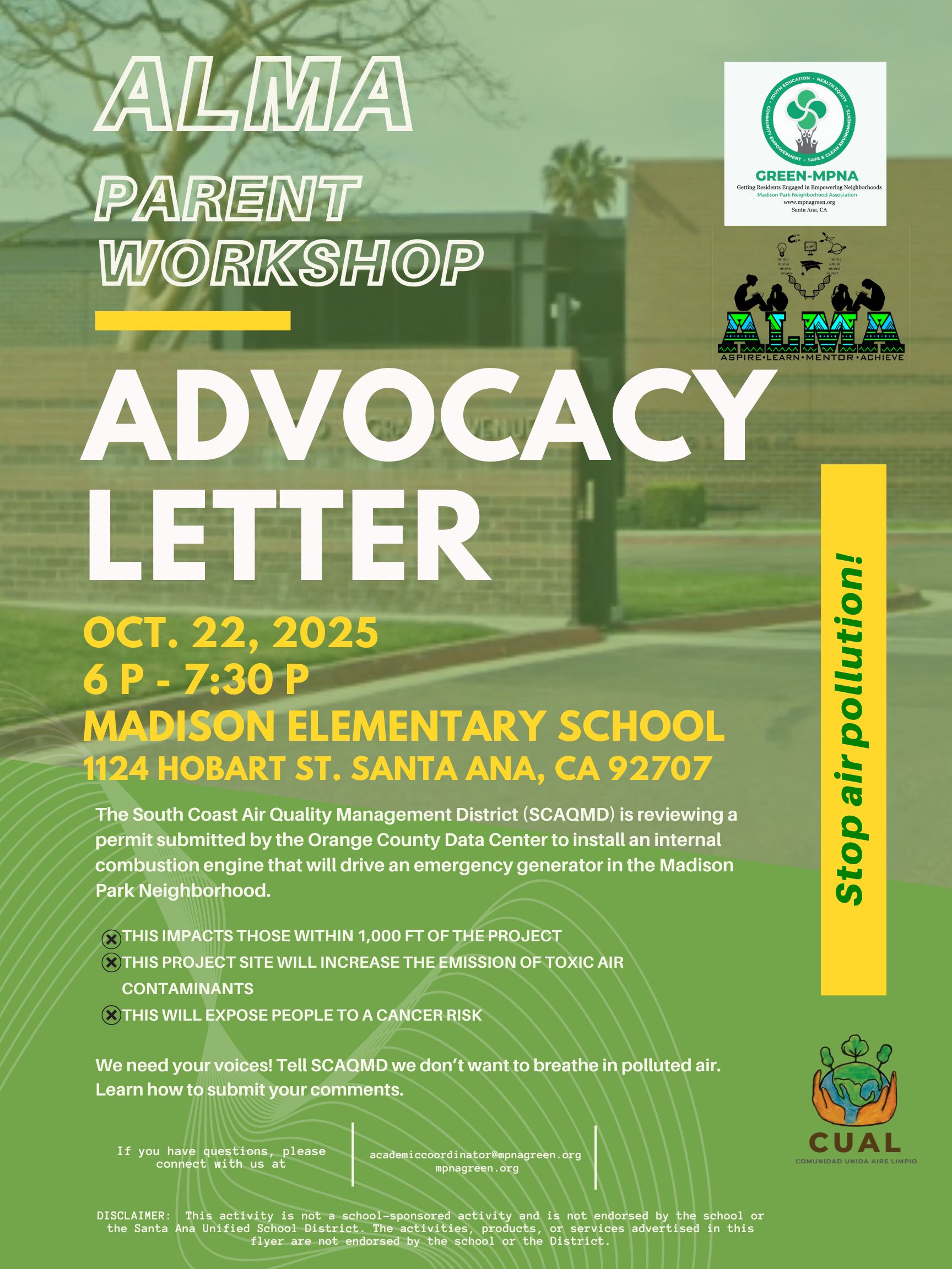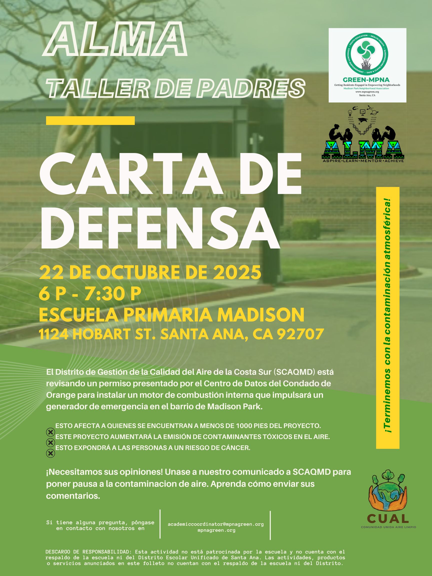Les recordamos que la Academia Científica ALMA del Dr. Zaldívar celebrará un taller para padres el miércoles 22 de octubre en la escuela primaria Madison, de 6:00 p. m. a 7:30 p. m. Este taller se centra en proporcionar información detallada sobre la carta que los padres recibieron del Distrito de Gestión de la Calidad del Aire de la Costa Sur (SCAQMD) sobre el Centro de Datos del Condado de Orange y la solicitud de un permiso que les permitiría emitir toxinas al aire. Además, les ayudará a comprender cómo pueden enviar comentarios y preocupaciones al SCAQMD. Cuantos más comentarios reciba el SCAQMD sobre este tema, más atención recibirá y les notificará las necesidades de la comunidad.