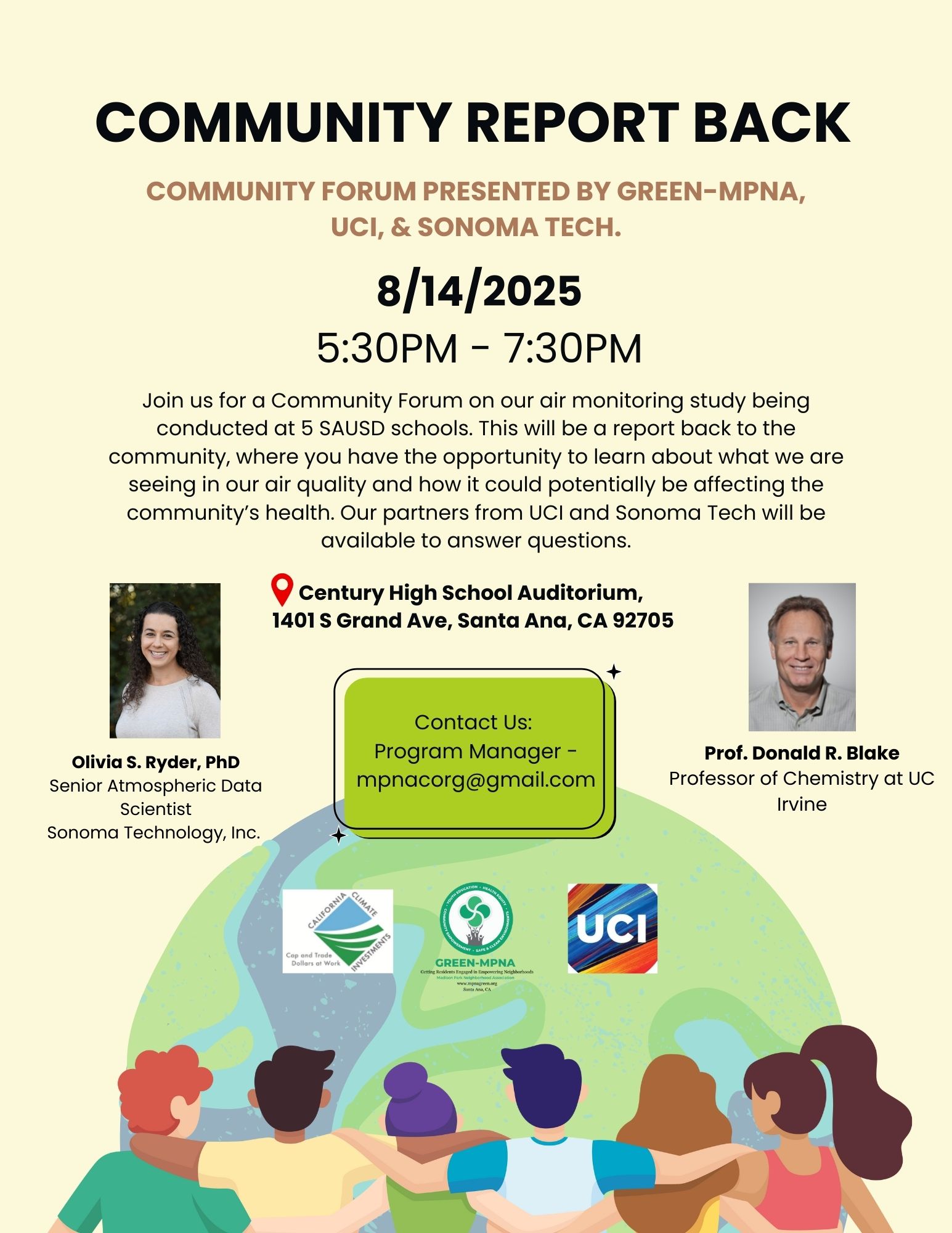 Join us for a Community Forum on our air monitoring study being conducted at 5 SAUSD schools. This will be a report back to the community, where you have the opportunity to learn about what we are seeing in our air quality and how it could potentially be affecting the community’s health. Our partners from UCI and Sonoma Tech will be available to answer questions.