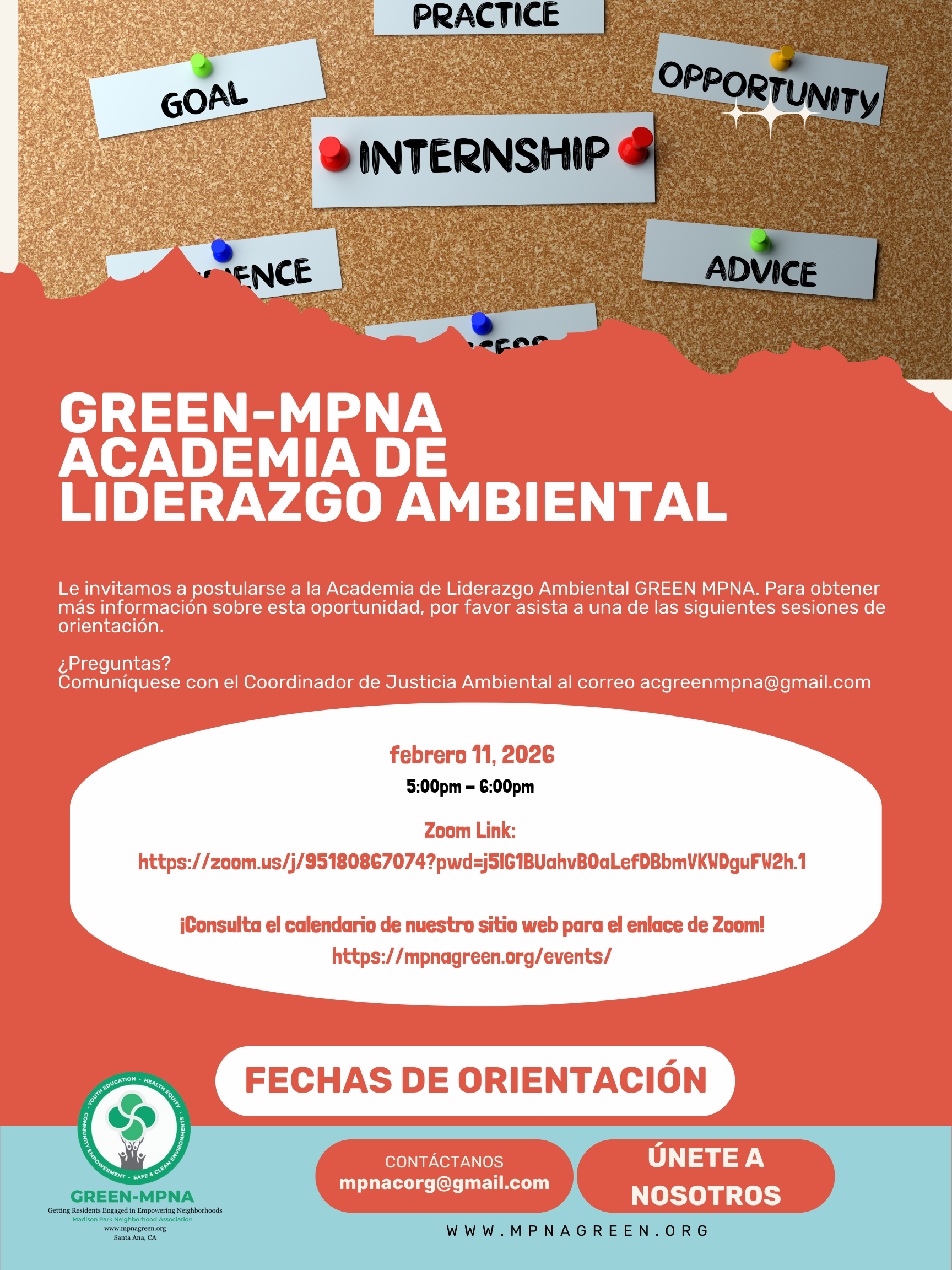 ¡Únete a nosotros para una sesión informativa sobre nuestra Academia de Liderazgo Ambiental! Esta academia está abierta para estudiantes de secundaria de los grados 10 y 11, así como para todos los adultos que residan y/o estudien en Santa Ana. Para cualquier pregunta o inquietud, comunícate con nuestro Gerente de Programa Leonel Flores en mpnacorg@gmail.com.