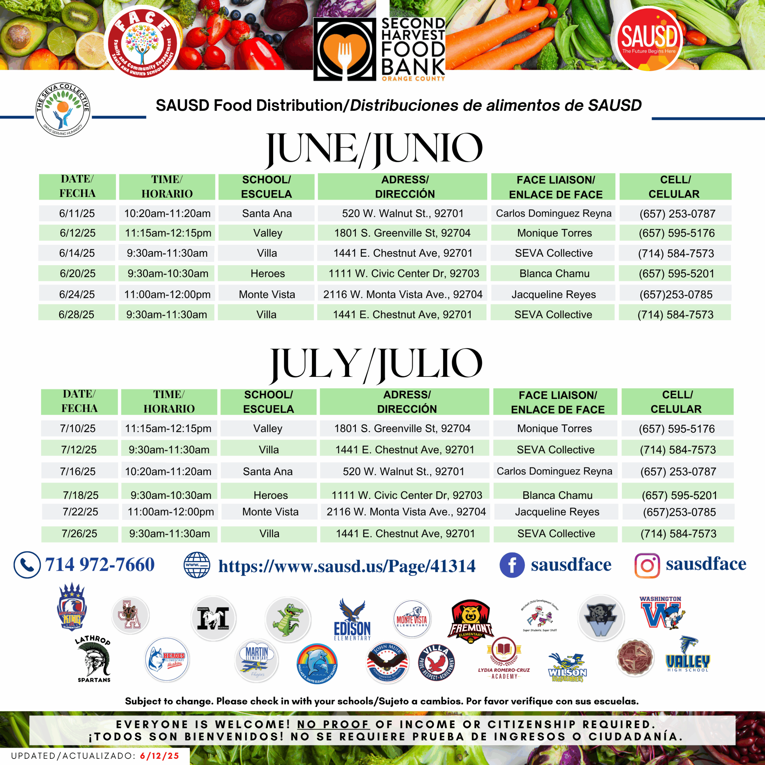GREEN-MPNA comparte con entusiasmo estos eventos comunitarios organizados por SAUSD y Second Harvest Food Bank. Estos eventos son gratuitos y abiertos a todos—no se requiere prueba de ingresos o ciudadanía.